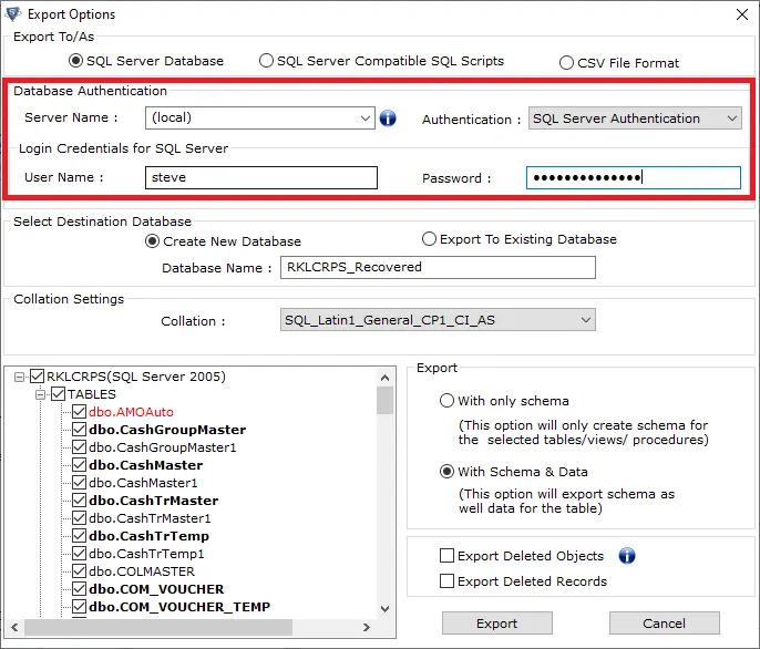- In the export window, add the required authentication credentials and then press the export button to resolve error 2 SQL Server.